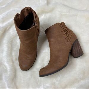 Round, close-toed bootie with thick stacked heel, stitching detail, and laces crossing over back