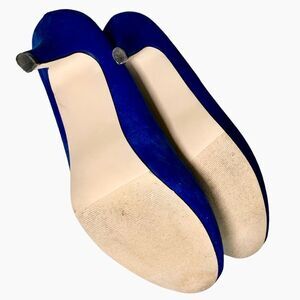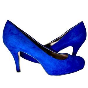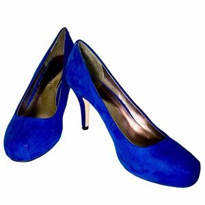 These cobalt blue faux suede high heels have a slightly rounded toe with a hidden platform. In excellent used condition. No box.
