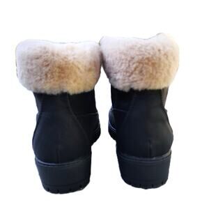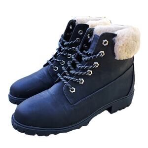 EUC: Trendy, "Frannkie" black paris faux leather upper ankle boots lined with cream faux fur collar / combat boot silhouette / lace up construction / rubber lug sole / almond toe / silver tone nut eyelets by Madden Girl.
