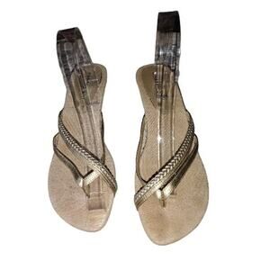 Elegant smooth and braided gold straps on a thong sandal with a 2 inch cork wedge, square toe.