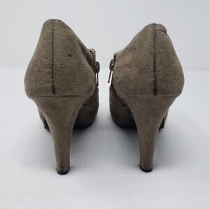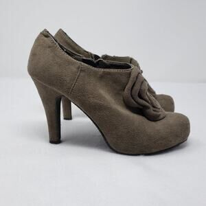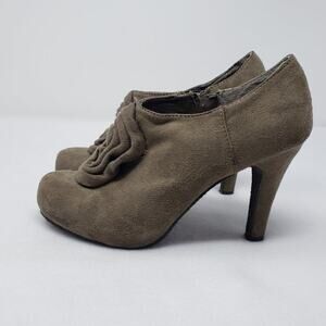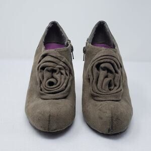 Gray ankle boots with a heel, flower design on the front, and Suede like material.