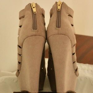Sand/taupe colored faux-suede peep-toe cage platform wedge. These beauties are super high but the platform makes them very comfortable! Worn 2-3 times; maintained with suede brush. Very slight darkening on R toe (see close-up, photo 4) that I never noticed before photographing. No other marks, stains, scrapes, or discoloration of 'suede'.