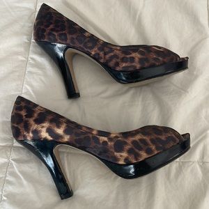 Worn but good condition. Some wear, scuffs, & small marks on the heels. No marks or stains on the leopard fabric. Please ask for more pictures if you are not sure how worn they are.
