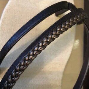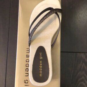 Description: Madden Girl Low/Mid Wedge Heel Thong-Sandal. Straps are Dark Brown and Metallic Bronze-Brown. Very clean other than a few spots on the sole.