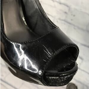 Patent Leather w/ lace design on heel/platform, right shoe has various scuffs, peeptoe, slingback, style: Jeeves, left shoe minimal wear marks. Preloved
