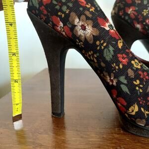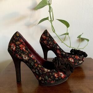 Brown fall floral fabric design, brown suede-like heel & rosette detail on toe, platform pump. The perfect, unique heel for the fall season! Pre-loved, in good condition. Only worn a few times!