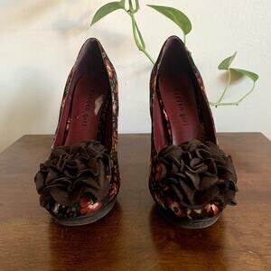 Madden Girl Salza Floral Fabric Platform Brown Suede-like Rosette Pumps Size 5.5