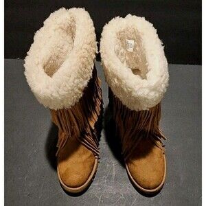 Madden Girl Sleet Fringe Hidden Wedge Boots Faux Fur Suede Chestnut Brown 9.5 M