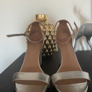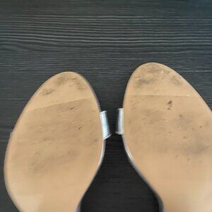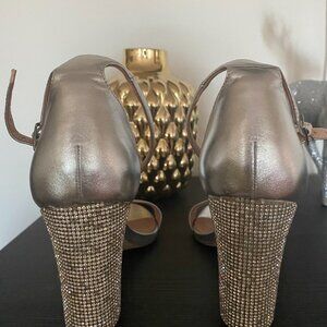 A sparkly heel that can be worn for special occasions. The block heel is about 3inches and covered in rhinestones. Straps around the ankle and toes. Some wear on the bottom.