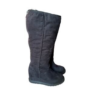 What a great pair of black boots with hidden heel of about 3” Sherpa lined for the cold day and is so cozy! Big metal exposed back full zippers!