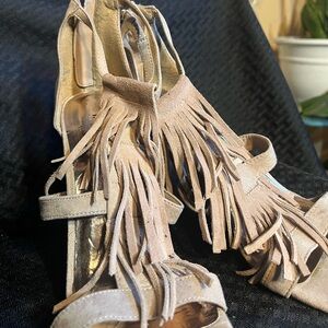 Stylish taupe heels with fringe detail. Elevate your look effortlessly.