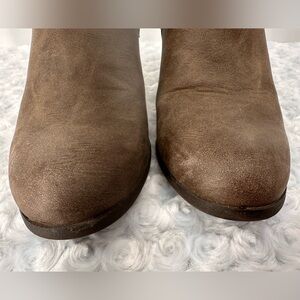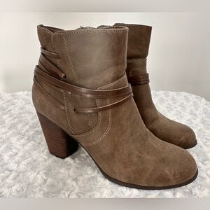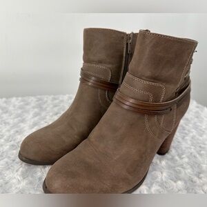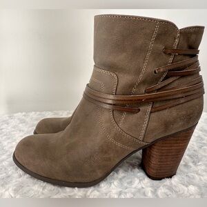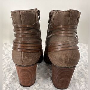 Madden Girl Faux, Vegan Leather Brown Taupe Boots. Cute leather like wrap detail around the ankles gives these an edgy look. Zips up the sides. Size 9