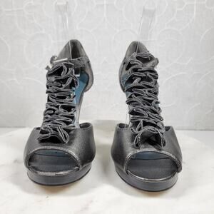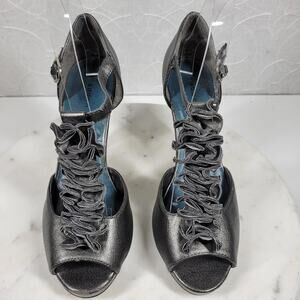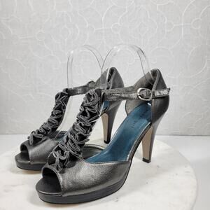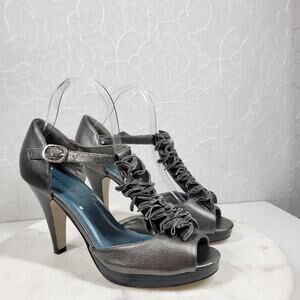 Madden Girl Womens Setra Heels 8 Gray Metallic Ruffle Trim T-Strap Peep Toe New