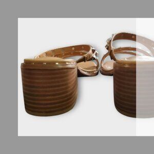 Step up your shoe game with these stylish Madden Girl Roamm sandals, size 8.5, tan color, new without tags. The straps are adorned with silver studs, giving them a modern and punk look. The 2.5" block heel is a comfortable mid-height, and the cushioned insole and stretch straps make them perfect for any occasion, from travel to workwear. These vegan sandals have a solid pattern and are made of faux leather and rubber soles.