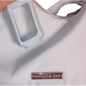 A stylish and trendy Madden Girl shoulder bag, perfect for adding a touch of Y2K flair to any outfit. This small handbag features a sleek silhouette with a top handle, making it easy to carry. The bag has a zippered closure to keep your belongings secure, and a compact interior ideal for essentials like your phone, wallet, and keys. The light blue color is versatile and complements a variety of styles. This bag is great for everyday use, a night out with friends, or as a chic accessory for special events.