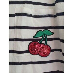 The shirt's chic accents include a sequin cherry patch that adds a sparkle to the classic striped pattern. Available in size XL, it's designed to be a versatile addition to your wardrobe, suitable for all seasons. Whether styled for a day out or a relaxed evening, this T-shirt blends comfort with a trendy edge.
