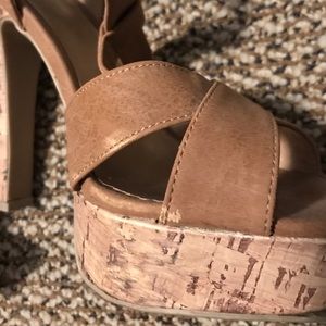 Tan platform heels- Cork type base and rubber bottom / scuffs shown on 2nd & 3rd photos.