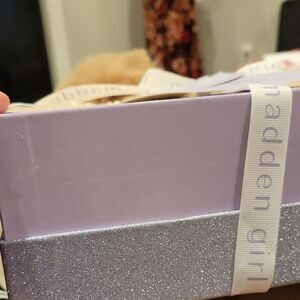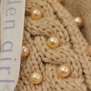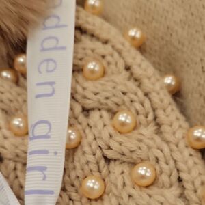 Stylish tan knit beanie with a fluffy pom pom. Features pearl embellishments. Perfect for a cozy look. Super soft scarf