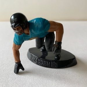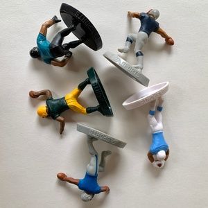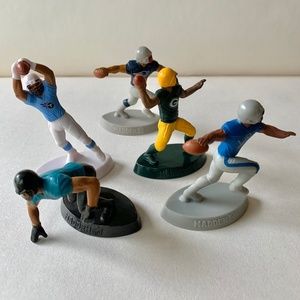 One price gets you all five figures shown. These are Madden NFL Football mini figures and are approx. 3 inches tall. distributed in McDonald Happy Meals in 2014. Each plastic figure stands on an attached wide base for stability. No moving parts. Teams in this set are: Jacksonville Jaguars, Tennessee Titans, Green Bay Packers, Detroit Lions, and New England Patriots. These would make fun cake toppers!