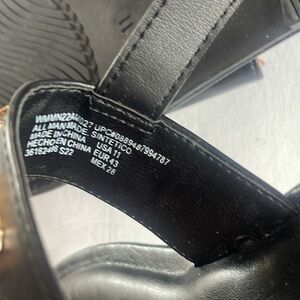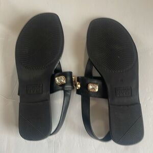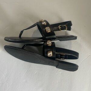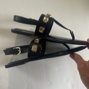Stylish black sandals featuring gold & rhinestone accents. Perfect for any occasion.See last pic of mark on inside sole - otherwise in good preowned condition - size 11
