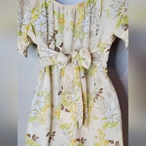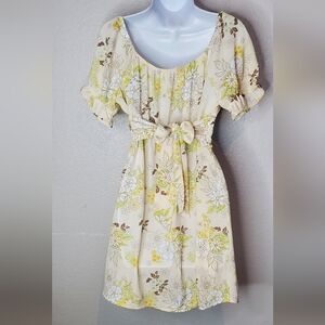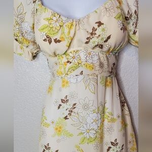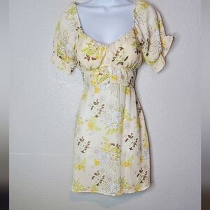Madden NYC Floral Yellow Tan Puff Sleeve Sweetheart Mini Sundress Retro 70s Vibe