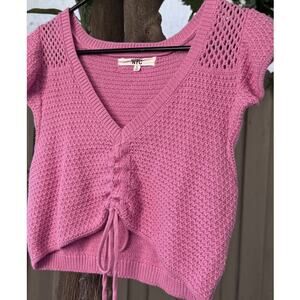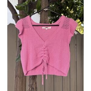 Bright and bold, this hot pink knit crop top from Madden NYC is perfect for adding a fun pop of color to your look. Featuring a flattering V-neckline, short cap sleeves with open knit detailing, and a ruched front tie that lets you adjust the fit, it’s both playful and versatile. The textured knit fabric gives it a cozy yet breathable feel, making it ideal for layering or wearing on its own. A trendy piece that pairs effortlessly with high-waisted jeans, skirts, or shorts for a chic Y2K-inspired vibe. Great condition.