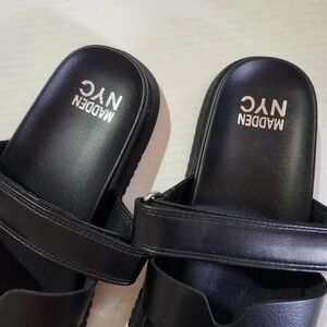 Madden NYC slip-on sandals in black faux leather with double strap and cut-out design. Lightweight and versatile. Pre-owned, in very good condition with light wear on soles (see photos).