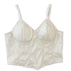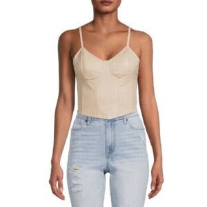 Madden NYC faux leather bustier crop top in a soft beige with adjustable spaghetti straps and a smocked back panel. Flattering sweetheart neckline and slim fit. Women’s size L.