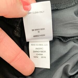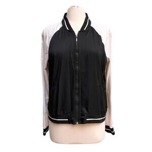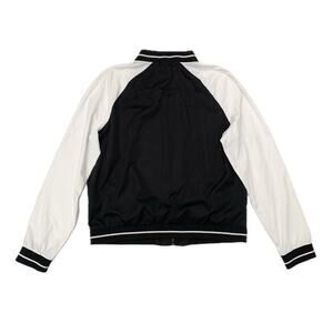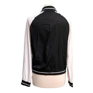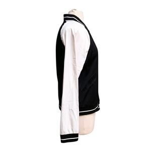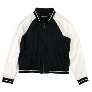 Madden zip up jacket, black and white color block contrast raglan sleeves, displayed on women’s size medium (8-10) dress form, gently worn overall good preowned condition