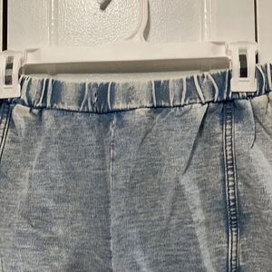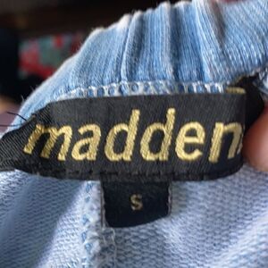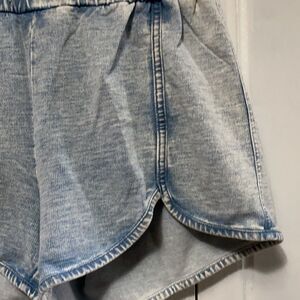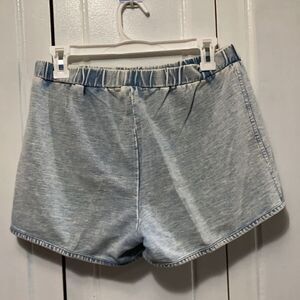 Madden 100% cotton chambray blue soft sweatshirt feeling shorts size small in gently worn condition. Does not have the waist pulls, but it’s not needed. Waist approximately 14” flat and inseam length approximately 3”.