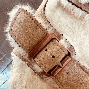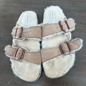 Cozy faux fur, slip-on sandals by Madden Girl with double tan, suede straps. Features contoured faux fur footbeds and adjustable straps for a perfect fit.