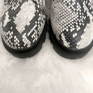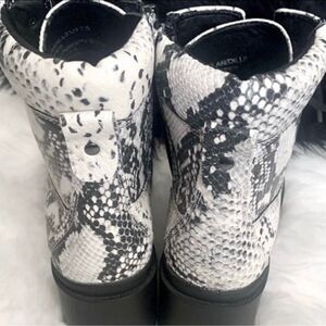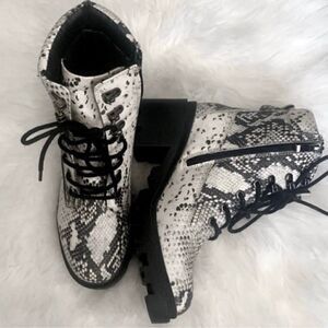 Cute black & white snakeskin print Dillan combat boots. Lace up. Side zip. Chunky lug sole. 3” heel. Faux leather upper. Worn once. In excellent condition. Madden Girl Size 7.5