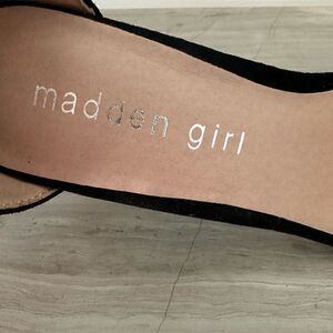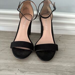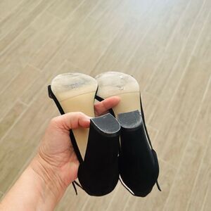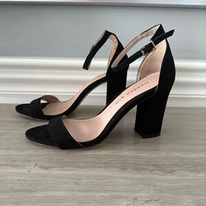Step out in style in these open toe, black suede sandals with adjustable ankle straps. Featuring 3 1/2” block heels. Slight discolor on bottom soles but overall excellent condition.