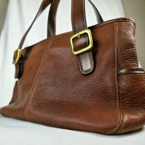 Description: Vintage-inspired Fossil Maddox satchel crafted from thick, durable pebbled leather in a rich cognac/whiskey brown. This versatile bag features a convertible design with both top handles and a removable long strap for crossbody or shoulder wear.