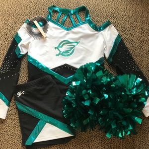 Costume was worn once and is in perfect condition. Comes with cheer top w/iron on school logo, cheer skort, two pom poms, unused gem hair comb, and unused teal eyeliner from Colourpop.