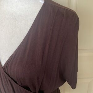 Made By Johnny Chocolate Brown Wrap Top Size Medium. This dolman top is perfect to add a touch of style to any outfit. Made from a soft, lightweight fabric (95% Rayon / 5% Spandex) that is comfortable and breathable. The V-neck gives a flattering shape and the wrapped front creates an elegant silhouette. The short sleeves are perfect for keeping cool in warm weather and the ruching style creates a figure-flattering look. The top has a relaxed fit. Gorgeous chocolate color. Great condition.