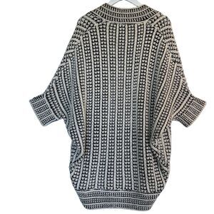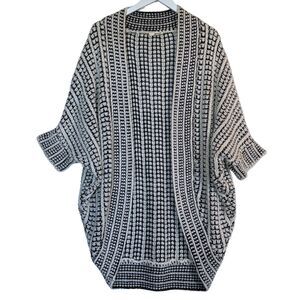 Cozy and unique Made oversized cocoon cardigan in a textured chunky knit. Features an open front, drop shoulder sleeves, and deep side pockets. Cream base with black woven grid design (appears cream rather than bright white).