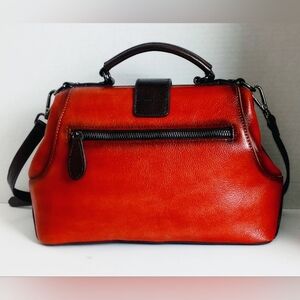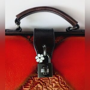 Absolutely stunning leather convertible crossbody satchel bag, made in India. Red, chocolate brown and tan, hand tooled genuine leather. Single top handle and adjustable removable crossbody strap. Flap with turn lock closure. Dark brown lining with interior zip compartment, zip pocket and two slip pockets. Medium size, measures approximately 11" wide, 8" high, 5" deep. Excellent condition. Ships same or next day.