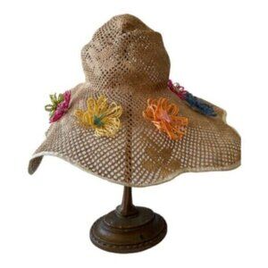 Vintage Italian wide brim summer sun straw hat. Open weave flower embellished raffia floppy hat. Measurements in pics. *Flaw-one of the flowers is missing (review pic- I'm still looking for it!) and the rest of the flowers are intact. There are a few cracks on the raffia at the top of the hat (see pic). Great for the beach, lake, garden party or interior decorating. Vintage condition.