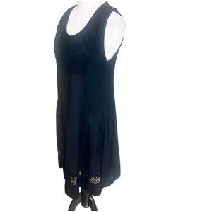 This Made in Italy linen sheath dress in size M/L features a crochet hem and stretch side waist. The dress is sleeveless with a scoop neck and pullover closure. It is knee length and suitable for occasions like travel, parties, or casual wear. The black color and bohemian Italian theme make it a stylish choice for summer, fall, or spring seasons. Made with care in Italy, this dress is machine washable for easy care.