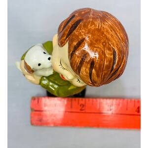 "Capture nostalgia with this charming vintage Japanese figurine—a joyful little boy with a playful puppy. Standing at 5" tall, he exudes happiness, depicted in brown pants, a green shirt, and black shoes with brown hair. Despite a small chip on his left foot, as shown in picture 8, his infectious laughter and the adorable brown and white puppy make him a delightful addition to any collection."
