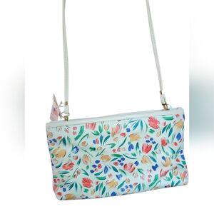 Made In USA White Leather Crossbody Bag With Multicolor Tulip Design. NWT