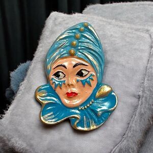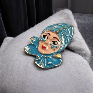 Add this vintage German Kuhn Kinn enameled woman’s face brooch to your collection. It’s a great conversation piece and will add a touch of flair to your outfit. Perfect for any occasion.