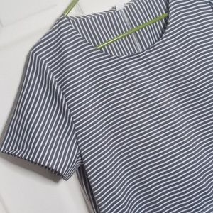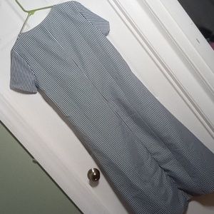 NWT! Women's Size Medium, blue and white vertical and horizontal striped oversized lagenlook fabric blend dress from Made With ❤️. 19" pit to pit and 50" back length from shoulder. curved neckline, short sleeves and skirt gathered at the bodice seam. beachy hippie festival retro artsy boho coastal farm lagenlook modesty granny swimsuit coverup leisure lounging