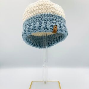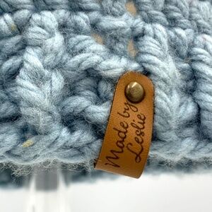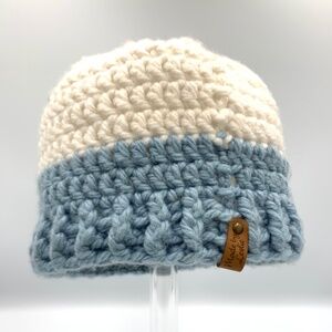 Made by Leslie, crochet beanie with baby blue bottom and cream top. Made by Leslie tag is leather. See photos for sizes. Beanie is very soft and warm.