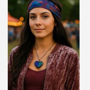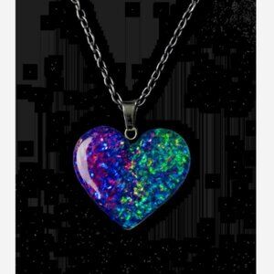 The Made by Vickie Heart Necklace is a handmade resin pendant featuring a heart shape with changing purple, silver and green spec colors. The necklace has a lobster clasp closure and is 22 inches long with a gunmetal Figaro chain. Perfect for special occasions like Mother's Day, Christmas, or anniversaries, this necklace exudes beauty, love, and a bohemian style. This necklace is a unique and eye-catching accessory for any jewelry lover.