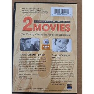 This is a DVD of the comedy films "Made for Each Other" and "That Uncertain Feeling" starring Jimmy Stewart, released in 1939. The run time is 178 minutes in black and white. The DVD is produced by Digital 1 Stop.