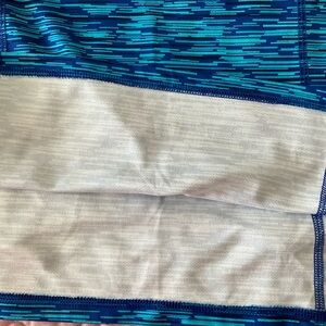 Vibrant blue patterned top. Comfortable and stylish. Perfect for excercise wear. Tiny whiteish discoloration on front bottom otherwise good condition.