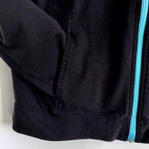 Made for Life unlined jacket in colorblock Black, Turquoise, Lime and White 100% polyester. Two front side-entry pockets, and Turquoise full front zipper. 20"W armpit to armpit. 24.25"L top of mid-shoulder to bottom edge. In good used condition. A cute retro look!