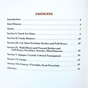 Features cased art glass, candy baskets, perfume bottles, puff boxes, lamps, jewelry, and novelties. Sections on opaque, crystal, and colored transparent glass, as well as pottery, porcelain, and semi-porcelain.